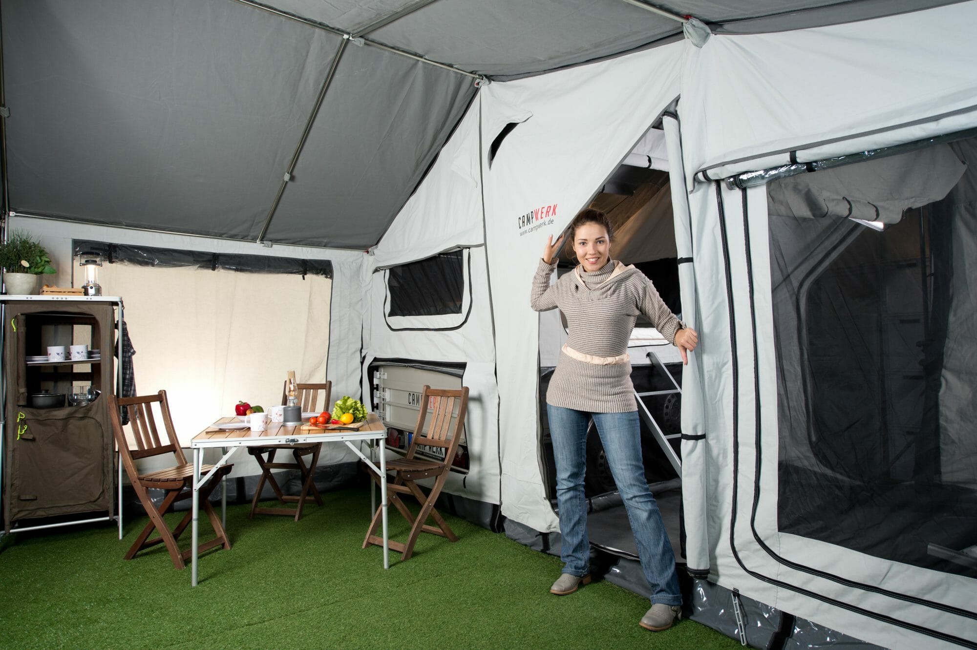 Spazio aggiuntivo può essere creato da una tenda aggiuntiva, una veranda o anche una tenda da sole. Ma anche un rimorchio tenda può servire come spazio espandibile. Questo può quindi essere utilizzato per dormire, cucinare, giocare, rilassarsi o per ulteriori possibilità di utilizzo.