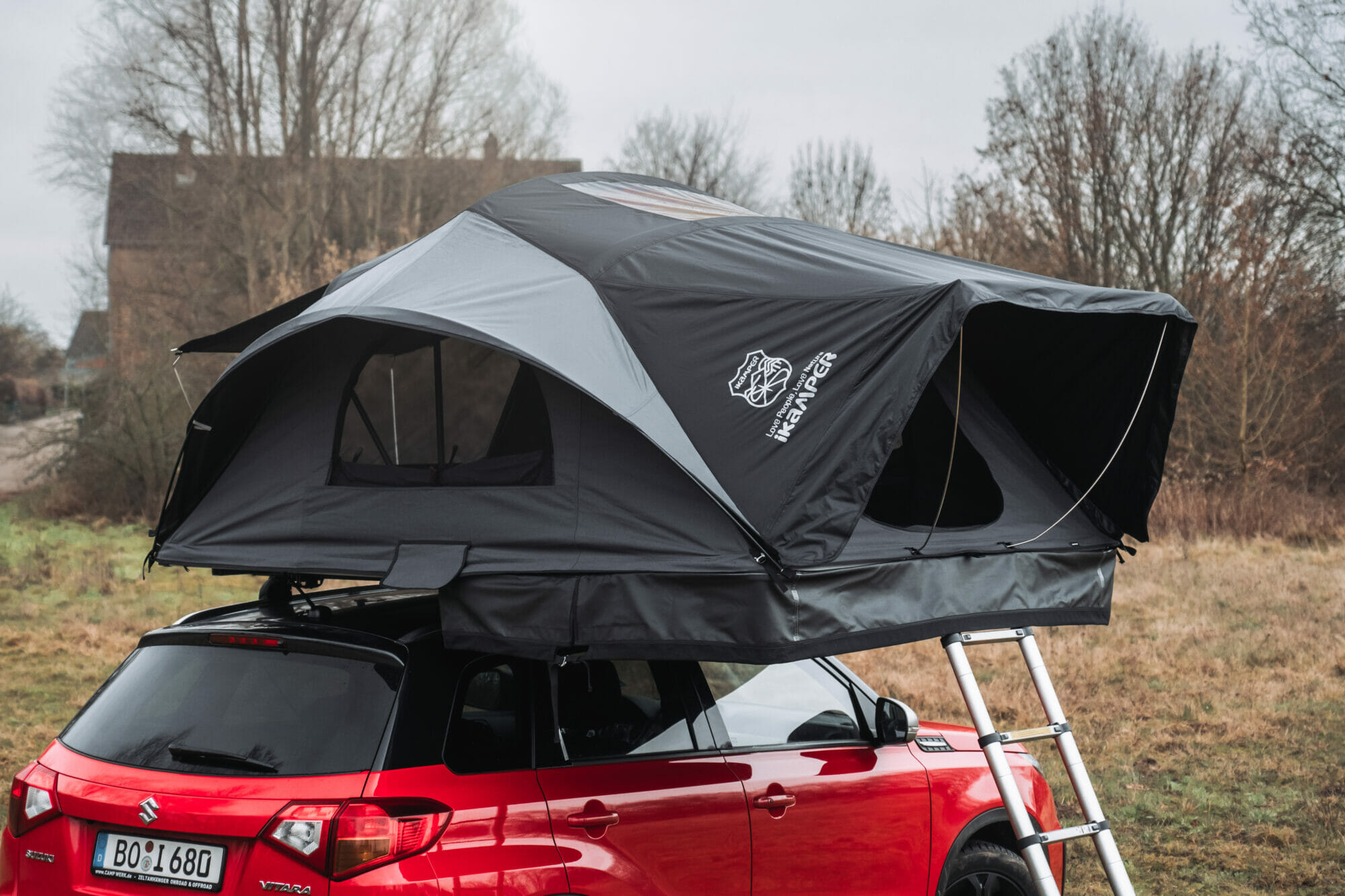 Tenda da tetto e portapacchi in uno – Particolarmente interessante è la tenda da tetto per auto per tutti coloro la cui gancio di traino è già occupato da un rimorchio per barche, un rimorchio per cavalli o simili. Finora, con una tenda da tetto, lo spazio per attrezzature sportive aggiuntive era esaurito. Con l’X-Cover 2.0 non è così!