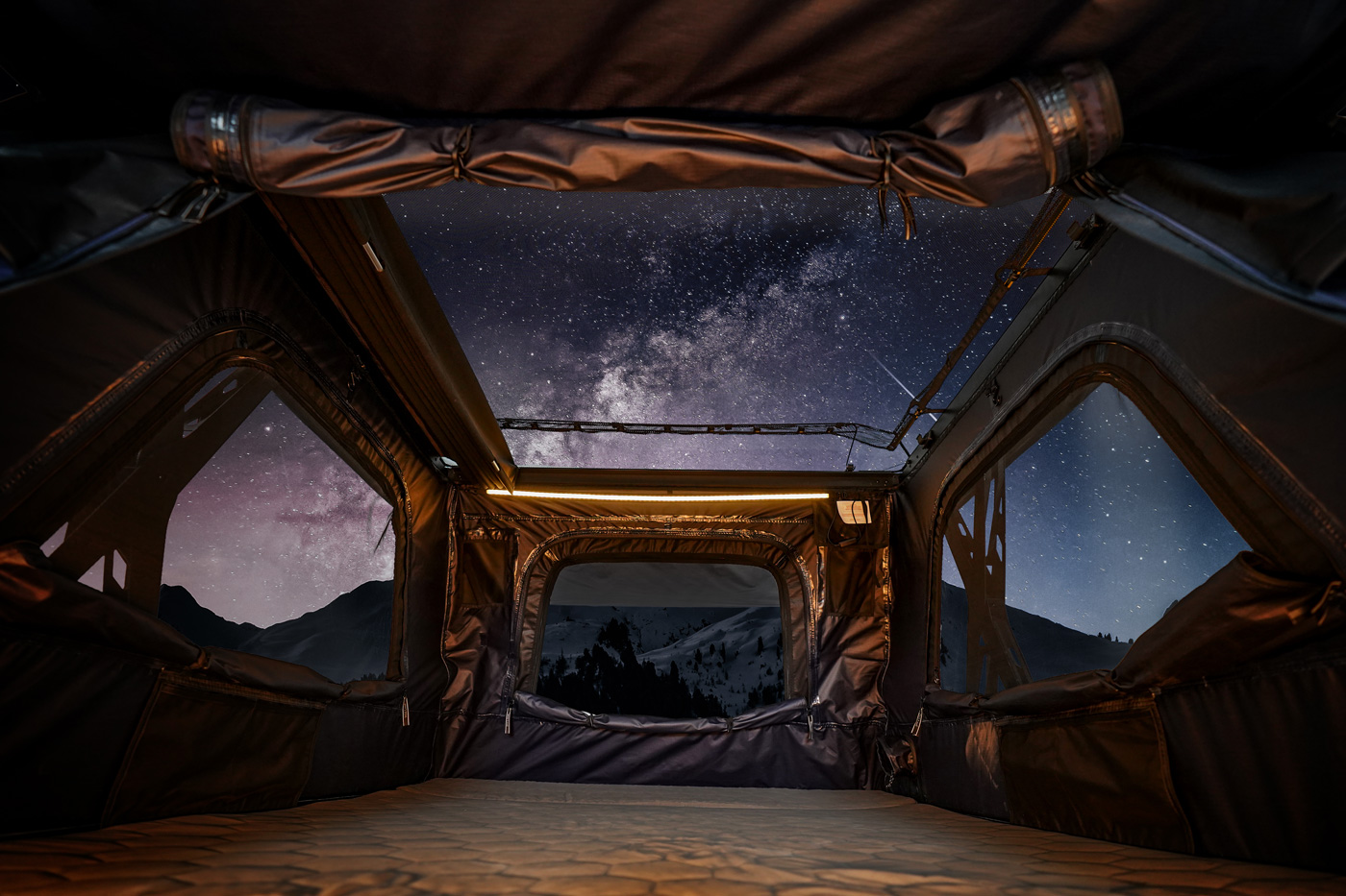 Per la Sky Rover viene utilizzato uno speciale tessuto outdoor che combina traspirabilità con estrema resistenza. Il tessuto della tenda è impregnato con un trattamento idrorepellente, particolarmente resistente agli strappi e ti protegge in modo affidabile da vento e intemperie. Allo stesso tempo, grazie alla sua struttura ben congegnata, garantisce un clima piacevole all’interno, sia in caso di caldo, pioggia o lunghi tour. In questo modo puoi concentrarti completamente sull’esperienza, mentre la tua tenda da tetto garantisce comfort e protezione.